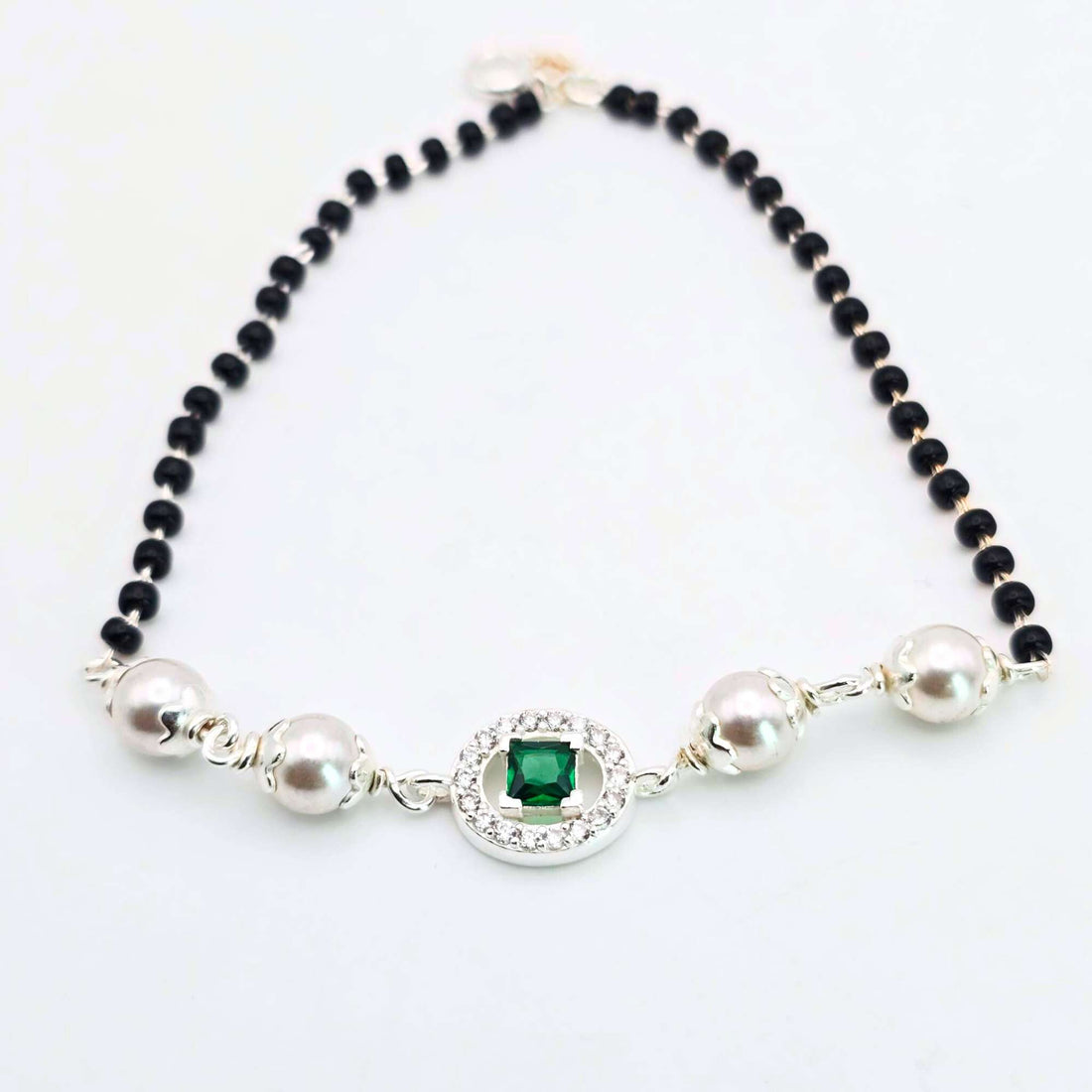 Discover our pure silver black bead bracelet featuring a stunning emerald-green centerpiece surrounded by a...