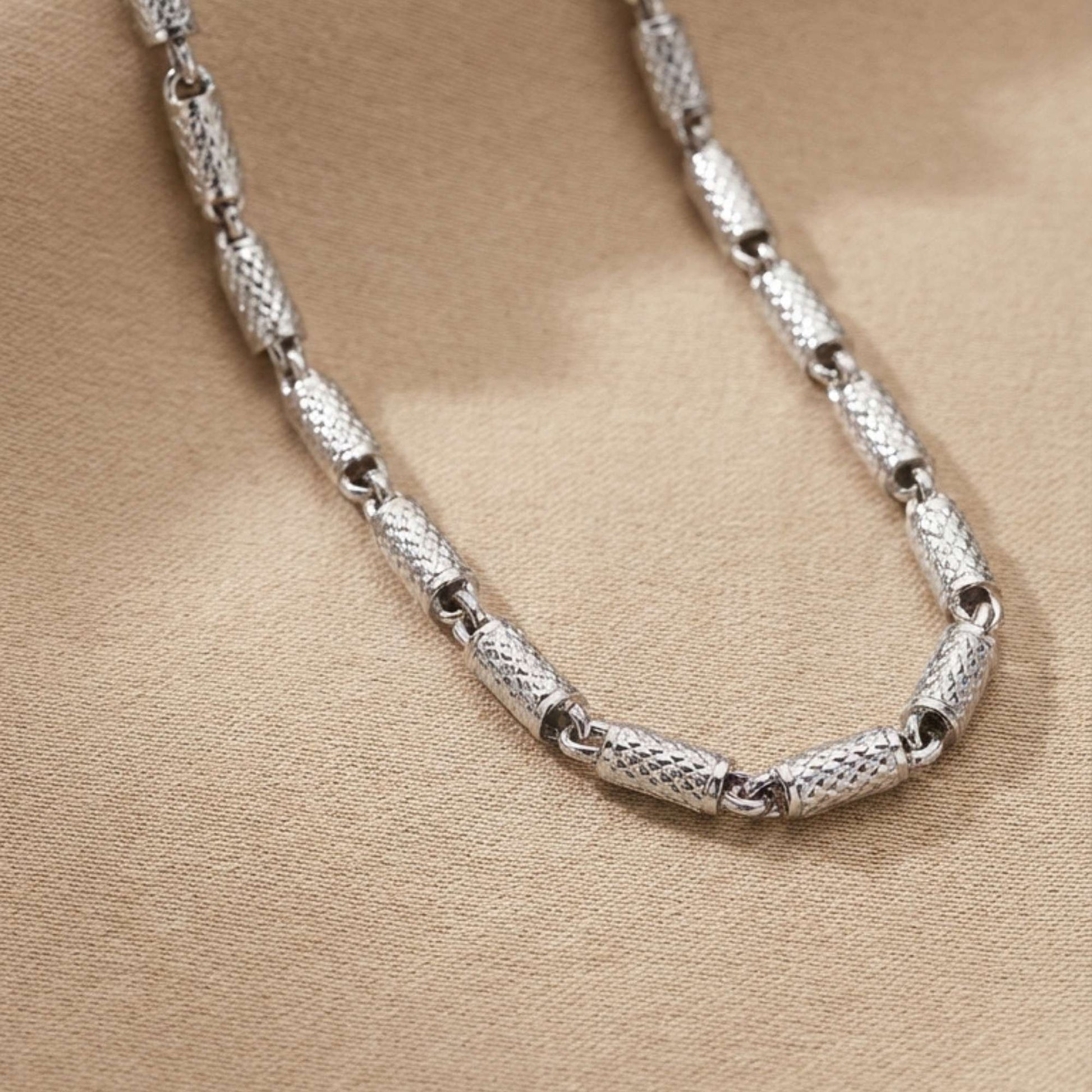 Discover our unique 925 sterling silver barrel link chain. This solid silver necklace features a high-polish finish and a distinct textured design. Shop now.