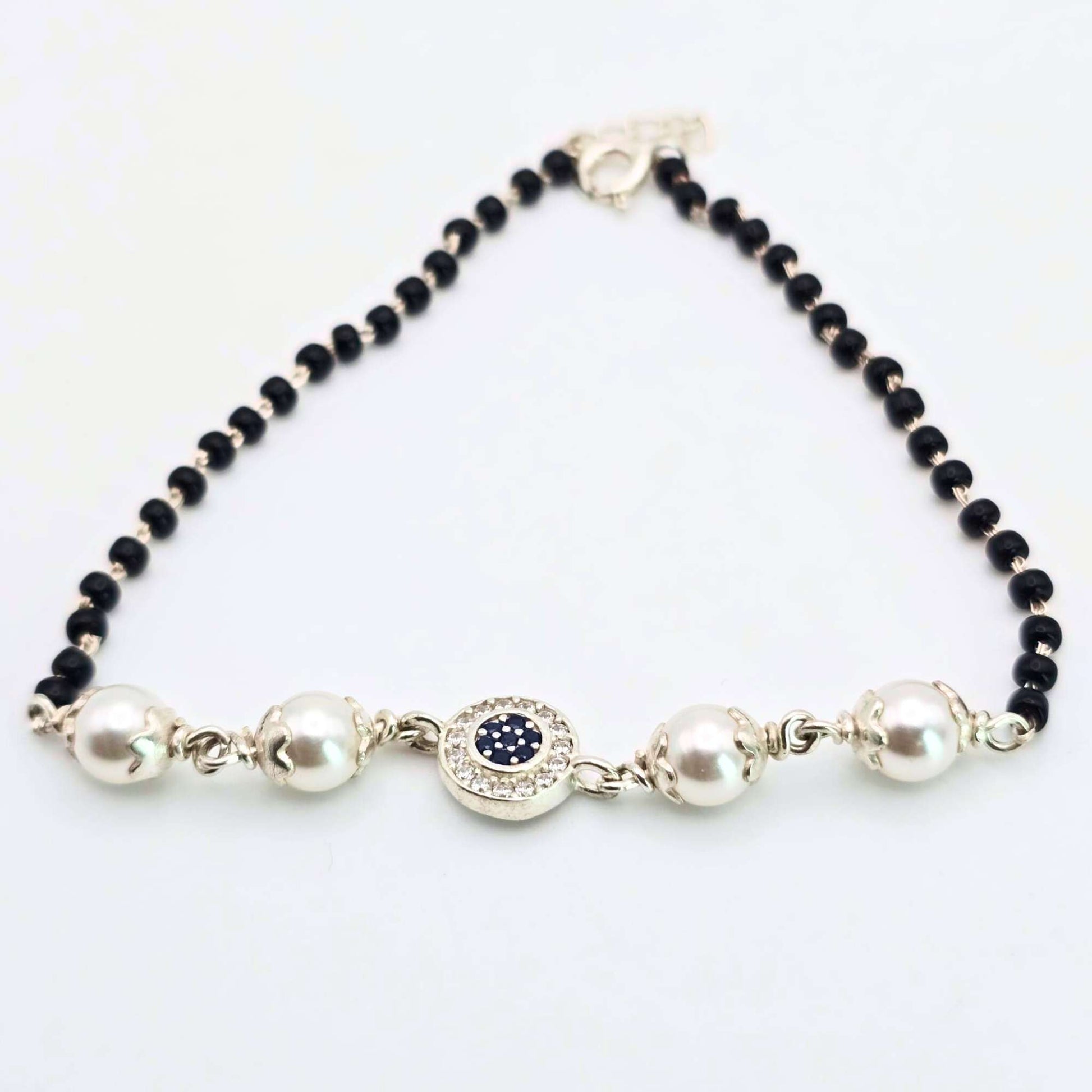 Authentic 925 sterling silver black bead bracelet featuring a brilliant crystal pavé evil eye charm and silver pearls. A perfect protective Nazariya for newlyweds and daily office wear. High-quality silver jewelry for women in Canada and USA.